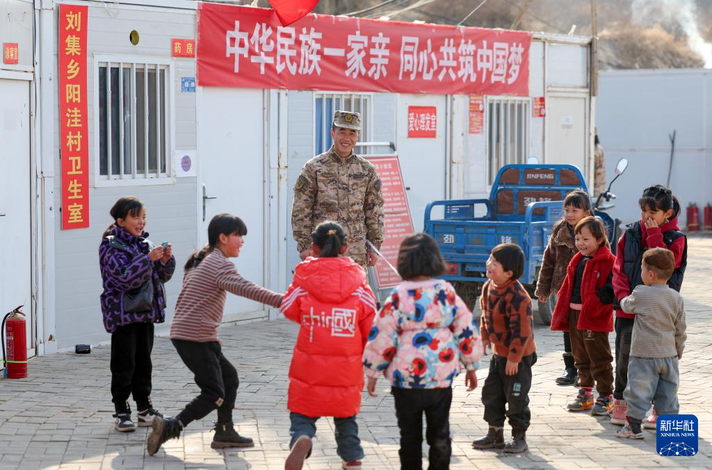 在甘肅省積石山縣陽(yáng)洼村,武警甘肅總隊(duì)臨夏支隊(duì)?wèi)?zhàn)士和小朋友做游戲(1月30日攝)。新華社發(fā)(侯崇慧 攝)