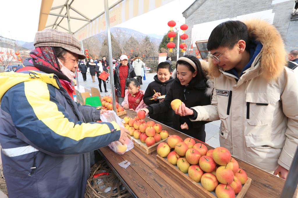 圖為游客在懷北古關(guān)迎春大集上購(gòu)買紅肖梨。(北京市懷柔區(qū)供圖)