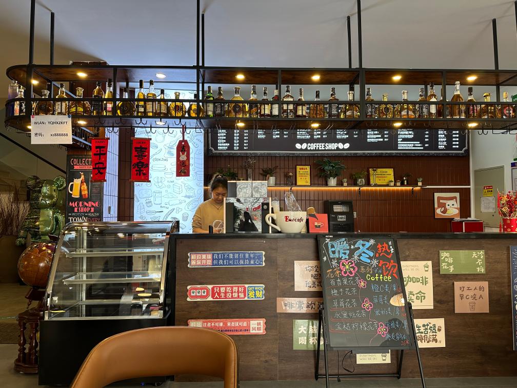 這頭集市熱鬧非凡,另一頭卻有一處鬧中取靜的去處。沿著河防口村主路走到村北,一棟米黃色的建筑格外亮眼,這里便是村里新開(kāi)的咖啡館——雁棲湖新知咖啡廳。