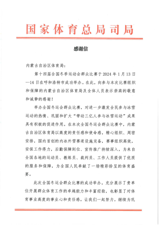 2月1日,國家體育總局群體司向內(nèi)蒙古自治區(qū)體育局發(fā)來感謝信,對內(nèi)蒙古自治區(qū)成功舉辦第十四屆全國冬季運(yùn)動會群眾比賽表示充分肯定和高度贊揚(yáng)。信中指出,舉辦全國冬運(yùn)會群眾比賽,對進(jìn)一步激發(fā)全民參與冰雪運(yùn)動的熱情、鞏固和擴(kuò)大“帶動三億人參與冰雪運(yùn)動”成果具有積極的促進(jìn)作用。本屆賽事賽道設(shè)施完備,賽事組織高效,后勤保障到位,宣傳推廣持續(xù)深入,為全國人民奉獻(xiàn)了一場精彩紛呈的體育盛宴。希望在共同努力下,為鞏固和擴(kuò)大“帶動三億人參與冰雪運(yùn)動”成果、推進(jìn)群眾冰雪運(yùn)動發(fā)展做出更大的貢獻(xiàn)。
