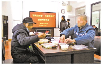 圖為軍天湖監(jiān)獄舉辦迎新春親情幫教活動現(xiàn)場,罪犯和家屬共進“年夜飯”。