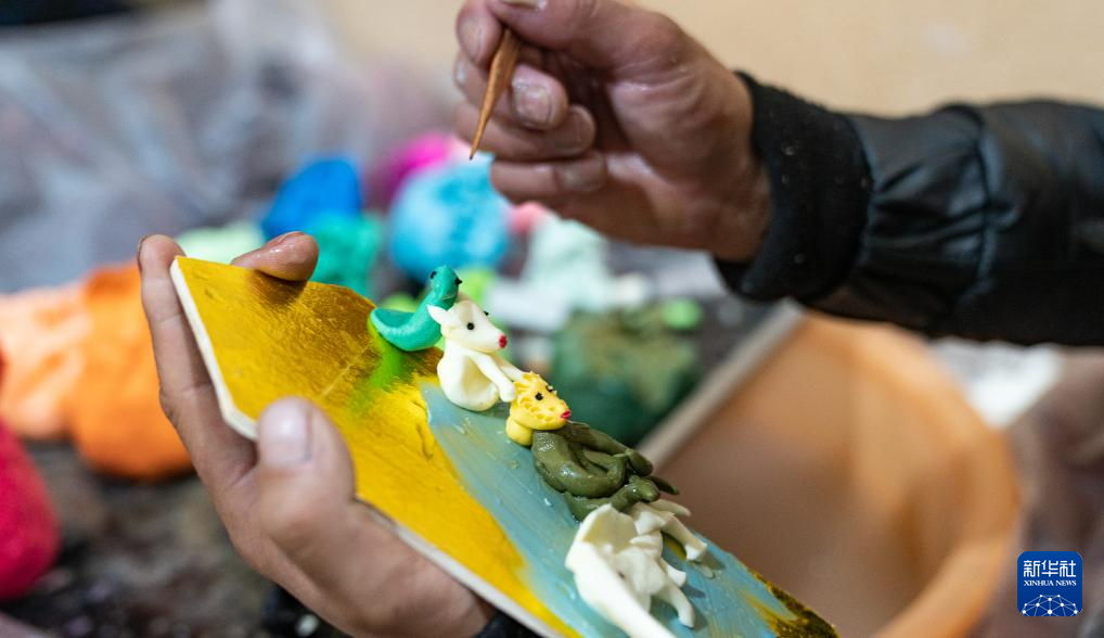 2月7日,在拉薩八廓商城,手工藝人在制作酥油花。