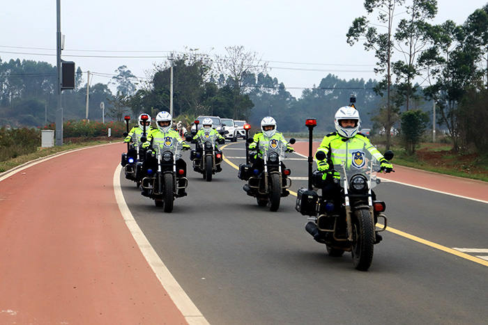 圖為警用摩托車巡邏小分隊在環(huán)島旅游公路峨蔓路段有序開展巡邏
