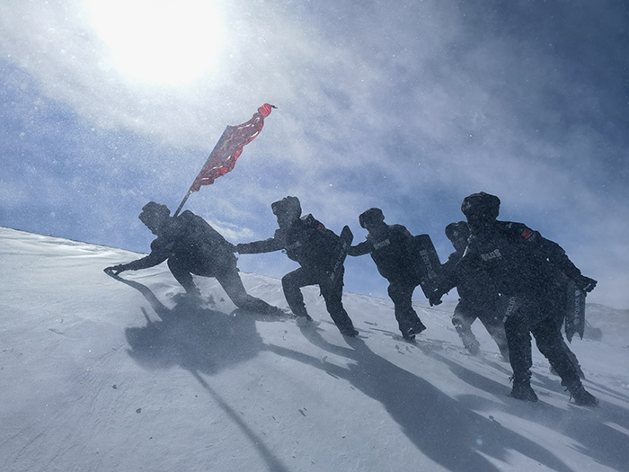 海拔越來(lái)越高,山脊坡度越來(lái)越陡。民警們開(kāi)始手腳并用埋頭攀爬,越往上爬,積雪越厚,空氣越稀薄,大家紛紛大張著嘴,不斷鼓起腮幫子,希望能多吸進(jìn)一些氧氣。