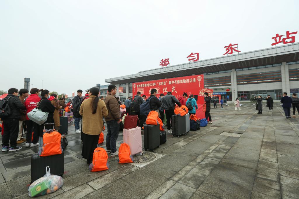 2月17日,來(lái)自貴州省黔南布依族苗族自治州各縣市的返崗務(wù)工人員在都勻東站廣場(chǎng)等待進(jìn)站,準(zhǔn)備乘坐返崗務(wù)工專列。新華社發(fā)(肖偉 攝)