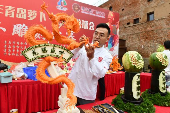 雕刻大師現(xiàn)場(chǎng)展示蘿卜雕刻絕活。崔冬妮攝