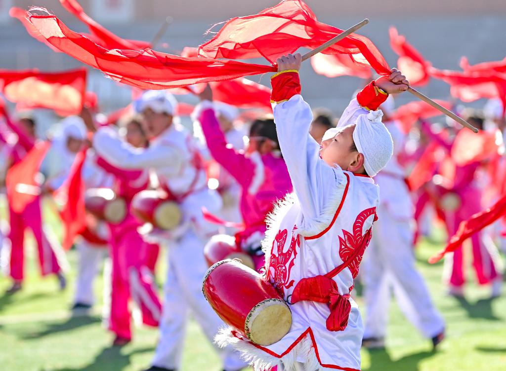 2023年11月16日,內(nèi)蒙古鄂爾多斯市鄂托克前旗第二小學(xué)的學(xué)生在大課間表演安塞腰鼓。該校將安塞腰鼓列入學(xué)校的校本課程和大課間活動(dòng),聘請民間藝人傳授技藝,讓非遺文化在校園中傳承。新華社發(fā)(王正攝)