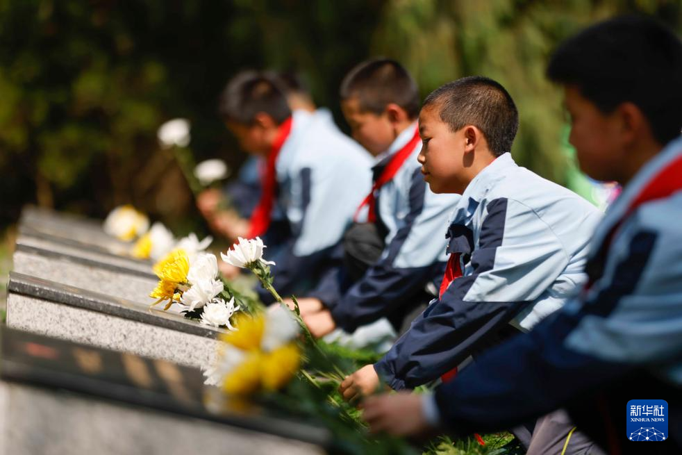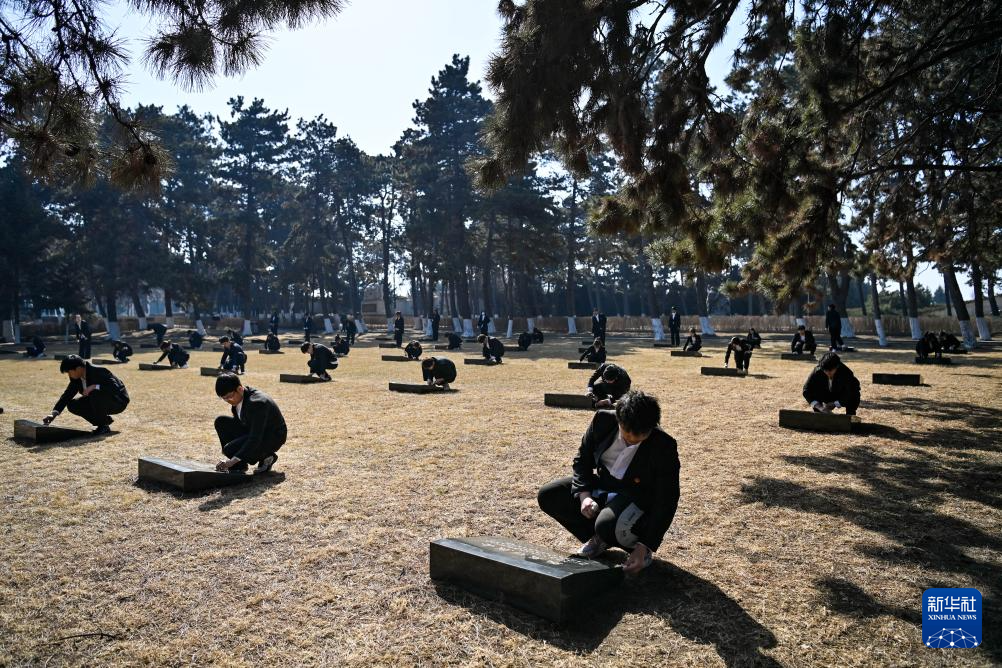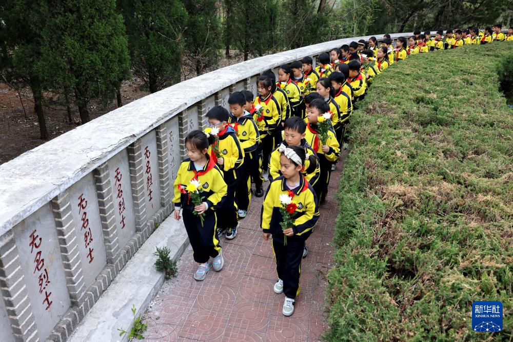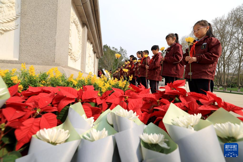 4月2日,在位于河北省石家莊市的華北軍區(qū)烈士陵園,學(xué)生們?yōu)楦锩⒘耀I花。