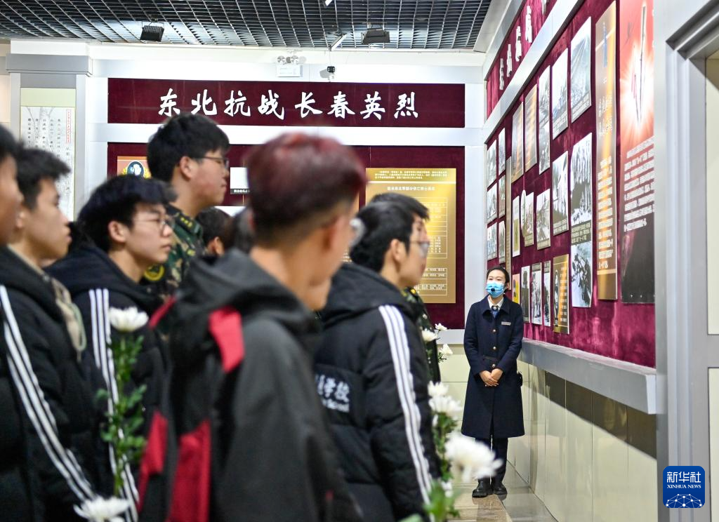 4月2日,長春革命烈士紀(jì)念館講解員給前來烈士陵園祭掃的學(xué)生講述東北抗戰(zhàn)歷史。