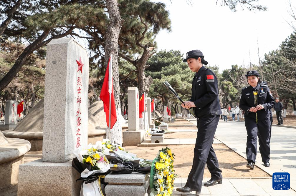4月2日,在沈陽抗美援朝烈士陵園,沈陽出入境邊防檢查站民警在烈士墓碑前獻花。