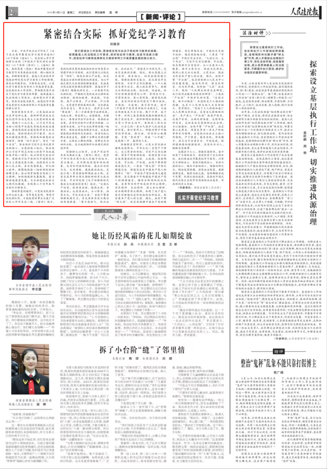 堅(jiān)持帶著問題學(xué),以更深為民情懷打牢從政之基。百年黨史表明,唯有守住紀(jì)律紅線,才能把黨的事業(yè)與最廣泛的民心牢牢系在一起。《條例》規(guī)定,黨的紀(jì)律是黨的各級組織和全體黨員必須遵守的行為規(guī)則。我們黨持之以恒反對“四風(fēng)”,推進(jìn)全面從嚴(yán)治黨,就是要通過全面加強(qiáng)黨的紀(jì)律建設(shè),為以中國式現(xiàn)代化全面推進(jìn)強(qiáng)國建設(shè)、民族復(fù)興偉業(yè)提供堅(jiān)強(qiáng)紀(jì)律保障。要通過學(xué)習(xí)《條例》增強(qiáng)紀(jì)律定力,一方面要守住紀(jì)律紅線。嚴(yán)格執(zhí)行黨的政治紀(jì)律和政治規(guī)矩,做到知敬畏、存戒懼、守底線,要嚴(yán)以修身、嚴(yán)以用權(quán)、嚴(yán)以律己,自覺遵守黨的各項(xiàng)紀(jì)律,讓紀(jì)律成為約束自己、修正自己、保護(hù)自己的“警戒線”。另一方面要堅(jiān)守法律底線。為政之要,惟在得人;治國理政,關(guān)鍵在人。要尊法學(xué)法守法用法。既要依法辦案,在審判實(shí)踐中以事實(shí)為根據(jù)、以法律為準(zhǔn)繩,公平公正地審理好每一起案件,確保法律適用精準(zhǔn)無誤,也包括要做到法理情的完美融合,設(shè)身處地從群眾角度出發(fā),著眼于為群眾實(shí)質(zhì)化解矛盾、從根本上解決問題,使群眾生活回歸正軌,真正起到維護(hù)社會(huì)穩(wěn)定的促進(jìn)作用。