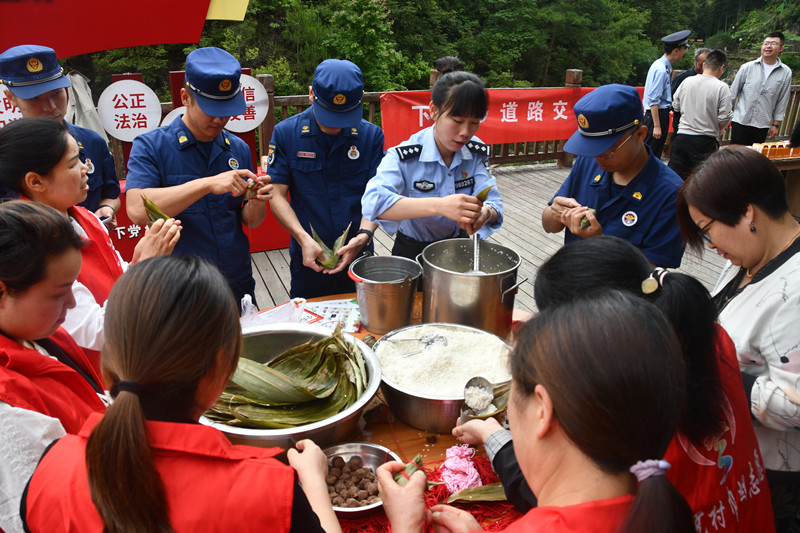端午節(jié)臨近,福建省壽寧縣公安局下黨派出所民警6月4日聯(lián)合消防員、志愿者等群防群治力量走進(jìn)轄區(qū)村居,與群眾一起包粽子,同時(shí)做好防盜防火防騙等宣傳。