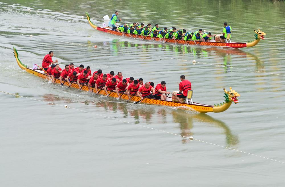 5月29日,在酉陽縣龍?zhí)舵?zhèn),龍舟隊(duì)在水面角逐。