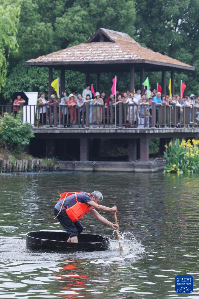 當(dāng)日,浙江省湖州市吳興區(qū)東林鎮(zhèn)舉辦“慶端午 劃菱桶”水鄉(xiāng)端午趣味民俗活動,來自東林鎮(zhèn)各村的村民們在泉益村參加了水鄉(xiāng)劃菱桶比賽、荷塘釣小龍蝦、做艾草花束、包粽子等端午趣味民俗活動,在初夏時(shí)節(jié)呈現(xiàn)江南水鄉(xiāng)特有的迎端午氣氛。