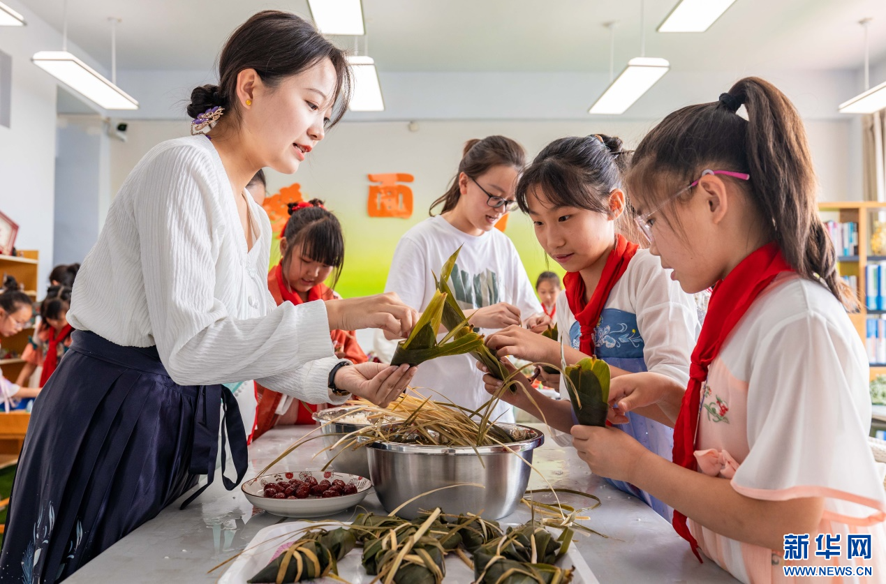 6月6日,呼和浩特市玉泉區(qū)通順街小學(xué)師生在“我們的節(jié)日·端午”主題活動(dòng)上包粽子。新華網(wǎng)發(fā)(丁根厚 攝)