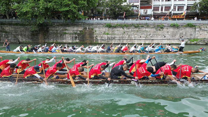 河面上船槳舞動(dòng)、水花四濺,一艘艘龍舟競速?zèng)_刺。這是今年端午節(jié)期間,貴州省鎮(zhèn)遠(yuǎn)縣舉行的賽龍舟活動(dòng)上的一幕。