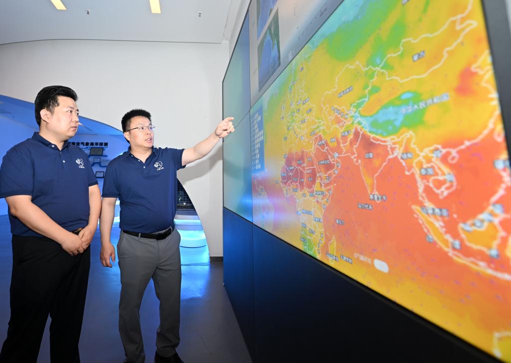 在云遙宇航的展廳內(nèi),李峰輝和同事分析經(jīng)過處理后的氣象衛(wèi)星數(shù)據(jù)(6月4日攝)。