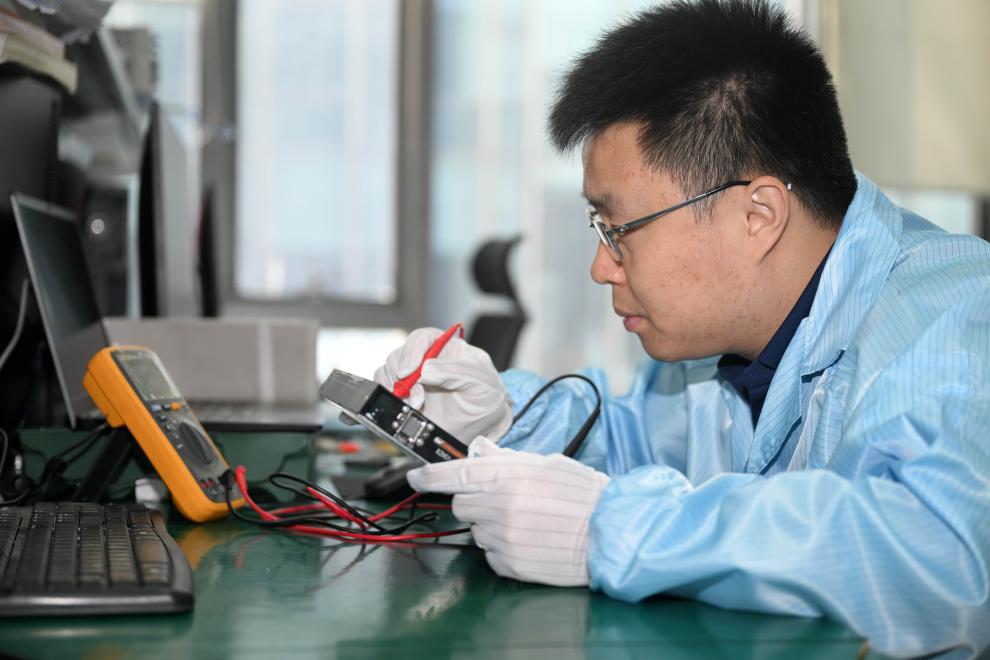 在云遙宇航的研發(fā)部,李峰輝測試衛(wèi)星核心部件的集成電路板(6月4日攝)。