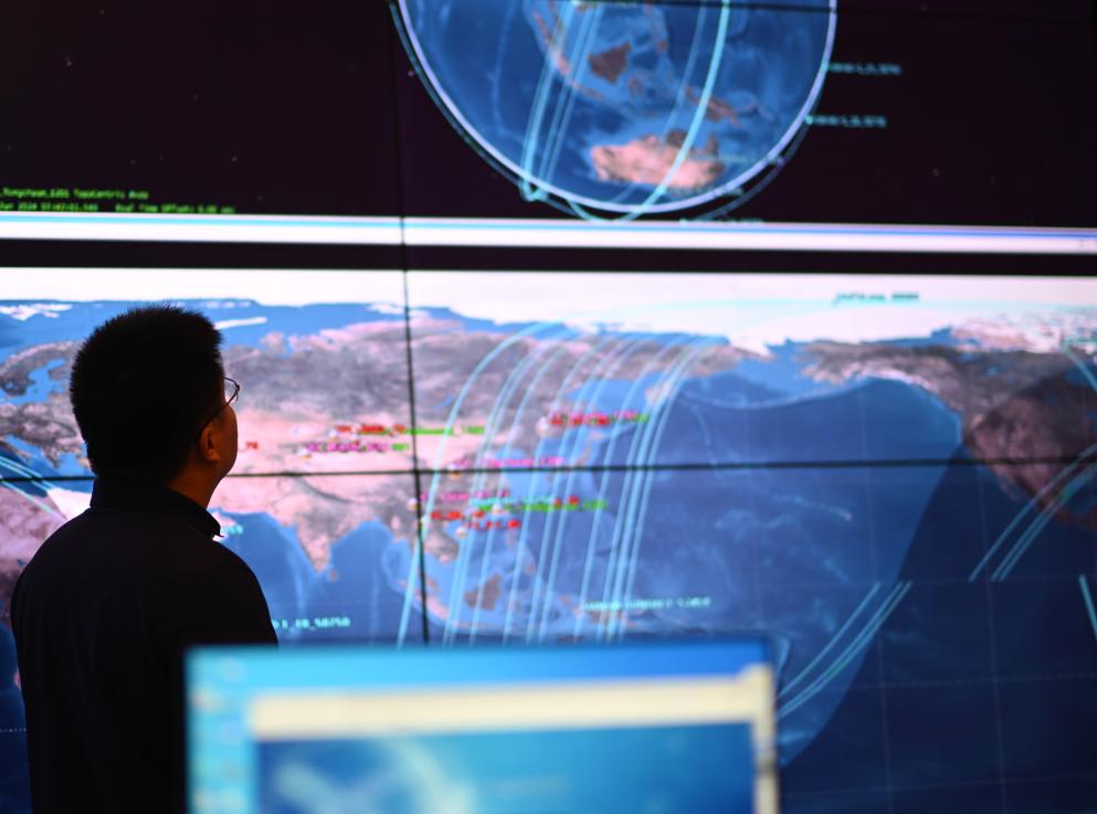 一塊超大顯示屏實時顯示著衛(wèi)星各項數(shù)據(jù)