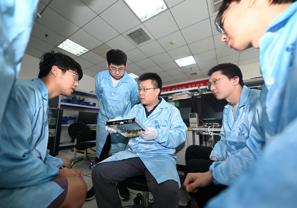 在云遙宇航的研發(fā)部,李峰輝和團隊成員討論一款衛(wèi)星核心部件的集成電路板(6月4日攝)。
