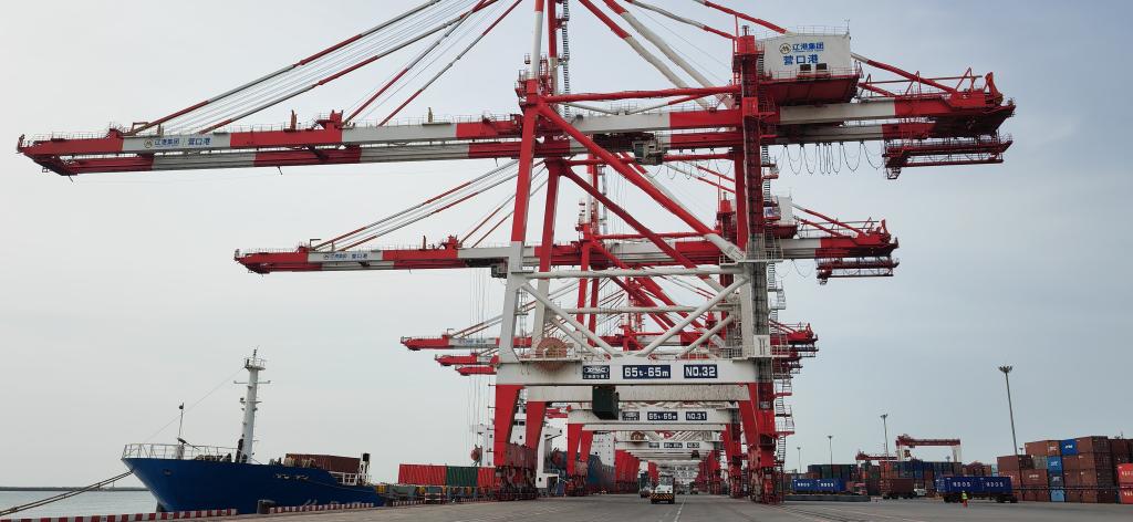 藍天碧海,波光粼粼。遼東灣畔的營口港集裝箱碼頭一派繁忙景象。巨型門式起重機將一個個集裝箱“抓”起,平穩(wěn)移至停靠在碼頭邊的貨輪上。堆場上,數(shù)量眾多的待發(fā)集裝箱整齊擺放,即將裝船出海。
