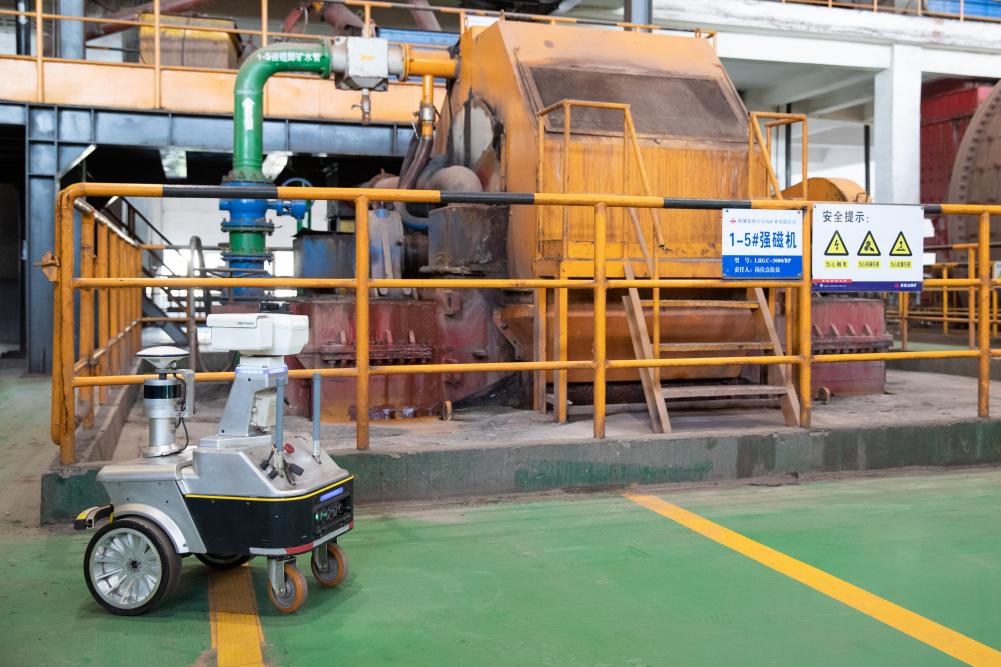 生產(chǎn)現(xiàn)場無人化,依靠什么來實現(xiàn)?步入磨磁車間,巨大的轟鳴聲在這個長約100米、寬約50米、高約30米的廠房內(nèi)回響。登上二樓作業(yè)平臺,兩臺直徑6.2米的大型球磨機上的轉(zhuǎn)輪正在飛速旋轉(zhuǎn)。不遠處,磨磁巡檢機器人閃爍著燈光,正在采集設備溫度、振動等狀態(tài)數(shù)據(jù)。