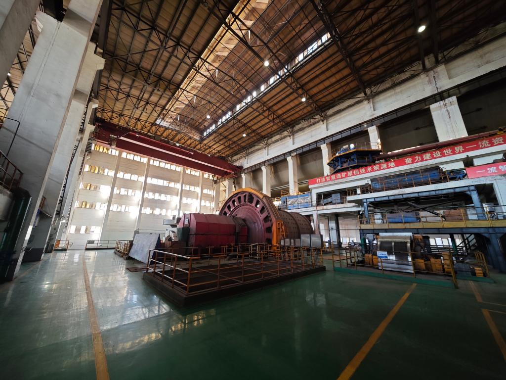 6月15日,關寶山礦山磨磁黑燈工廠里正在運轉(zhuǎn)的球磨機。新華社記者李鋼 攝