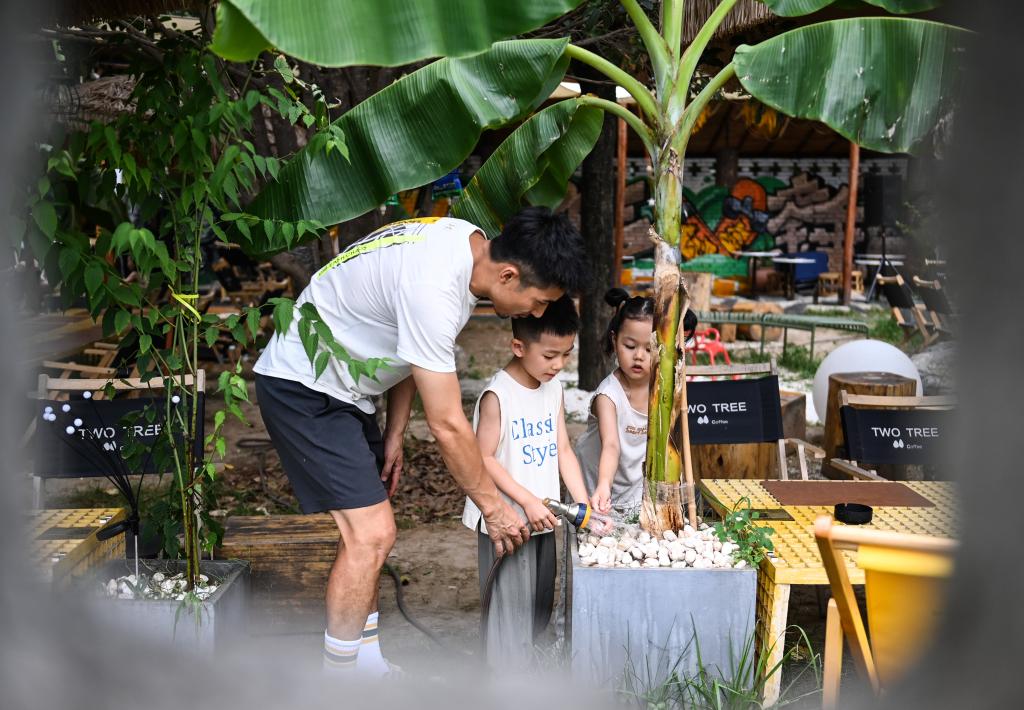 6月20日,土錘咖啡館服務(wù)員與小游客在咖啡館內(nèi)為植物澆水。新華社記者 蔡湘鑫 攝