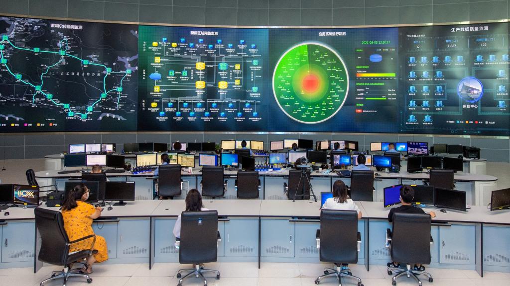 2023年12月6日,中國石油新疆油田公司生產(chǎn)指揮中心的監(jiān)控大屏實時顯示油田生產(chǎn)動態(tài)數(shù)據(jù)。新華社發(fā)(閔勇 攝)