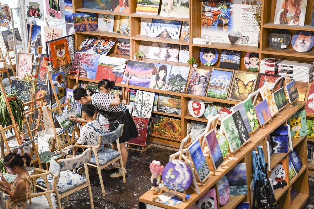 ↑7月15日,游客在重慶市江北區(qū)北倉(cāng)文創(chuàng)街區(qū)體驗(yàn)繪畫。