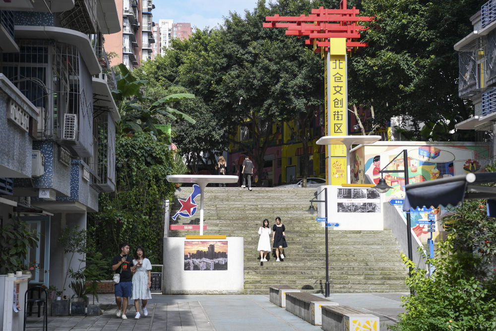 ↑7月15日,游客在重慶市江北區(qū)五里店街道鶯花巷合作村青年國(guó)際社區(qū)游覽、拍照。