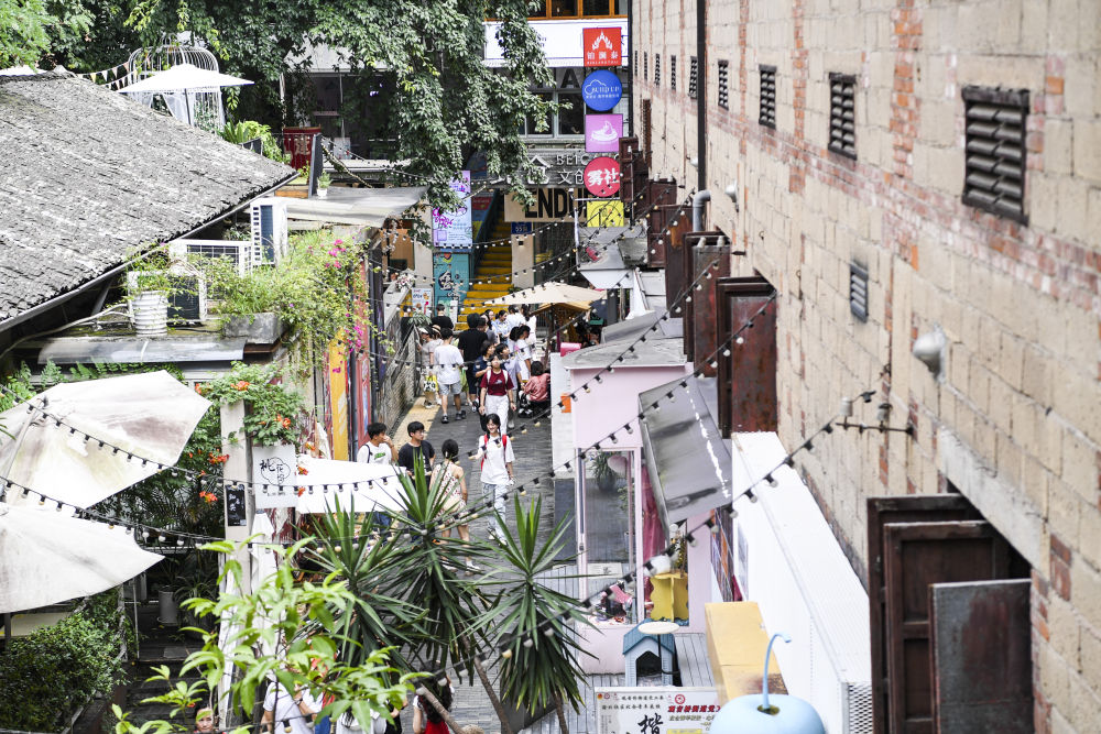 ↑7月15日,游客在重慶市江北區(qū)北倉(cāng)文創(chuàng)街區(qū)休閑、選購(gòu)文創(chuàng)商品。
