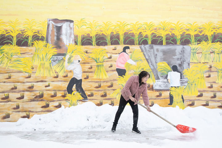 黑龍江省漠河市北極鎮(zhèn)北紅村“遠方故里”民宿負責人張翠花在清理積雪(2023年1月12日攝)。新華社記者 張濤 攝