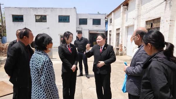 圖為今年四月二十六日,江蘇省揚州市江都區(qū)人民法院邵伯人民法庭副庭長胡買梅(右三)就一起排除妨害糾紛案件向當(dāng)事人釋法明理。
