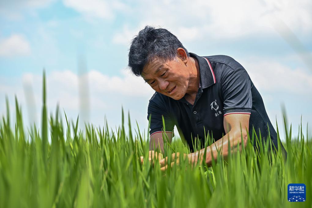 7月25日,安徽鳳陽小崗村種糧大戶程夕兵在田里觀察水稻長(zhǎng)勢(shì)。新華社記者 李鑫 攝