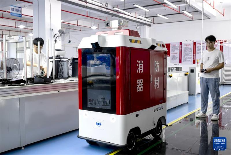 8月1日,技術(shù)人員在福建漢特云智能科技有限公司生產(chǎn)線上調(diào)試消防智能巡邏機(jī)器人。