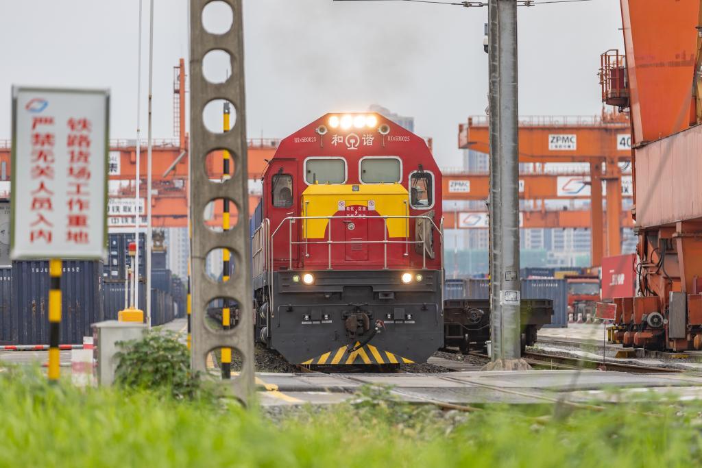 7月30日,在重慶國際物流樞紐園區(qū),一列裝載機械設備、汽車和筆記本電腦的中歐班列從重慶團結村中心站駛出。新華社記者 黃偉 攝
