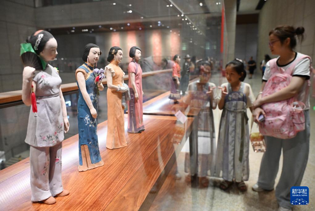 8月7日,中國工藝美術館展廳舉行的中華歷代服飾泥塑展吸引游客駐足觀看。