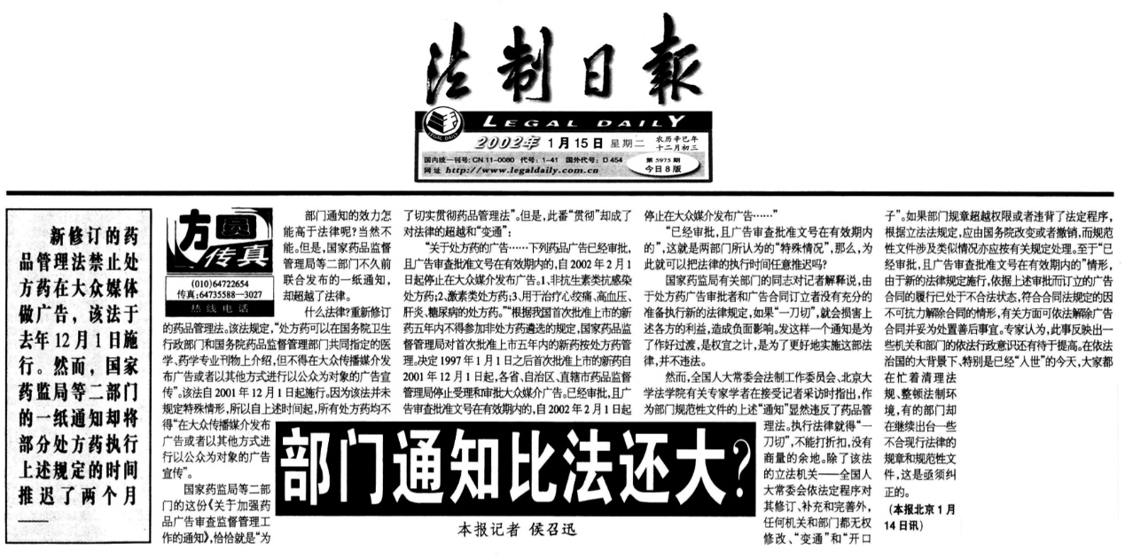 2001年修訂的藥品管理法禁止處方藥在大眾媒體做廣告,然而國(guó)家藥監(jiān)局、國(guó)家工商總局下發(fā)《關(guān)于加強(qiáng)藥品廣告審查監(jiān)督管理工作的通知》卻將部分處方藥執(zhí)行上述規(guī)定的時(shí)間推遲了兩個(gè)月或更久。針對(duì)這個(gè)情況,我采寫(xiě)批評(píng)報(bào)道《部門(mén)通知比法還大?》,刊于2002年1月15日《法制日?qǐng)?bào)》一版。報(bào)道指出,作為部門(mén)規(guī)范性文件的上述“通知”顯然違反了藥品管理法。除了該法的立法機(jī)關(guān)——全國(guó)人大常委會(huì)依法定程序?qū)ζ湫抻?、補(bǔ)充和完善外,任何機(jī)關(guān)和部門(mén)都無(wú)權(quán)修改、“變通”和“開(kāi)口子”。此事反映出一些機(jī)關(guān)和部門(mén)的依法行政意識(shí)和水平、乃至最基本的法律意識(shí),都還滯留在一個(gè)不高的層面。在依法治國(guó)大背景下、特別是已經(jīng)“入世”的今天,有的部門(mén)卻在繼續(xù)出臺(tái)一些不合現(xiàn)行法律的規(guī)章和規(guī)范性文件,是亟需糾正的。報(bào)道反響較大,1月17日,我繼續(xù)作跟蹤報(bào)道《豈能非法變通或“架空”法律》,全國(guó)人大常委會(huì)法工委、國(guó)務(wù)院法制辦有關(guān)負(fù)責(zé)人和參加過(guò)藥品管理法最初起草的老專(zhuān)家和黑龍江讀者提出,一些法律在實(shí)施中有時(shí)被部門(mén)的規(guī)章或規(guī)范性文件“架空”,一個(gè)行政部門(mén)就這樣把法律實(shí)施時(shí)間說(shuō)推遲就推遲是不合法的,不能因?yàn)檫w就一些實(shí)際困難而犧牲法律的權(quán)威性和嚴(yán)肅性。報(bào)道在一定程度上“揭開(kāi)了蓋子”“敲開(kāi)了冰山一角”。