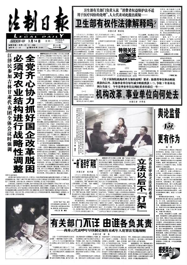 2000年九屆全國(guó)人大三次會(huì)議期間,我作為上會(huì)記者采寫(xiě)《衛(wèi)生部有權(quán)作法律解釋嗎》,報(bào)道全國(guó)人大代表對(duì)衛(wèi)生部此前聲稱(chēng)“消費(fèi)者權(quán)益保護(hù)法不適用于醫(yī)療糾紛處理”很不理解,法學(xué)專(zhuān)家也不贊同,認(rèn)為這種“聲明”具有法律解釋性質(zhì),衛(wèi)生部只能對(duì)自己頒布的規(guī)章等進(jìn)行解釋?zhuān)@個(gè)“聲明”并不具有法律效力。此報(bào)道刊于《法制日?qǐng)?bào)》2000年3月14日一版報(bào)眼。次日又發(fā)追蹤報(bào)道《衛(wèi)生部向人大代表作解釋》。第三天衛(wèi)生部來(lái)人向本報(bào)作解釋?zhuān)谌缎l(wèi)生部向本報(bào)作解釋》未能發(fā)出。