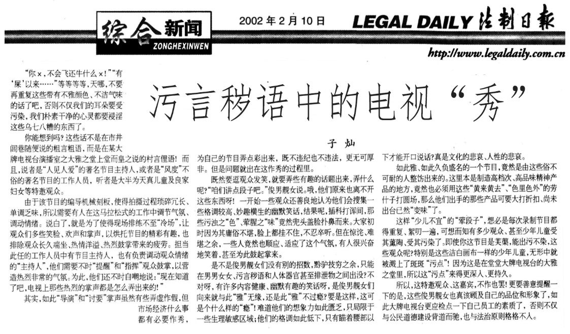 2002年2月10日,《法制日?qǐng)?bào)》刊發(fā)《污言穢語(yǔ)中的電視“秀”》。