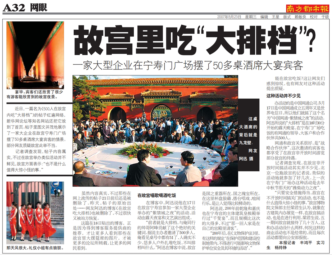 2007年5月17日,作為國(guó)務(wù)院新聞辦網(wǎng)絡(luò)局人員,受命參加當(dāng)時(shí)中國(guó)網(wǎng)通公司在故宮搞的成立五周年活動(dòng),認(rèn)為在重點(diǎn)文物保護(hù)單位大張旗鼓搞此種活動(dòng)涉嫌違反文物保護(hù)法。遂將所拍部分照片配文,“故宮是國(guó)之重器所在,國(guó)之瑰寶所在,在這里杯盤(pán)狼藉、搭臺(tái)唱戲、喧鬧行樂(lè),是讓人覺(jué)得比較稀奇的”,次日在新浪博客發(fā)出。新浪博客即以《大風(fēng)中故宮飯局龍門(mén)陣》為題推薦至首頁(yè),閱讀量很快超過(guò)20萬(wàn),熱度較高。新華網(wǎng)發(fā)展論壇等轉(zhuǎn)推至首頁(yè),《南方都市報(bào)》為此作了專(zhuān)題報(bào)道《故宮里吃“大排檔”?》,引起更大關(guān)注,人們普遍質(zhì)疑活動(dòng)不當(dāng)。