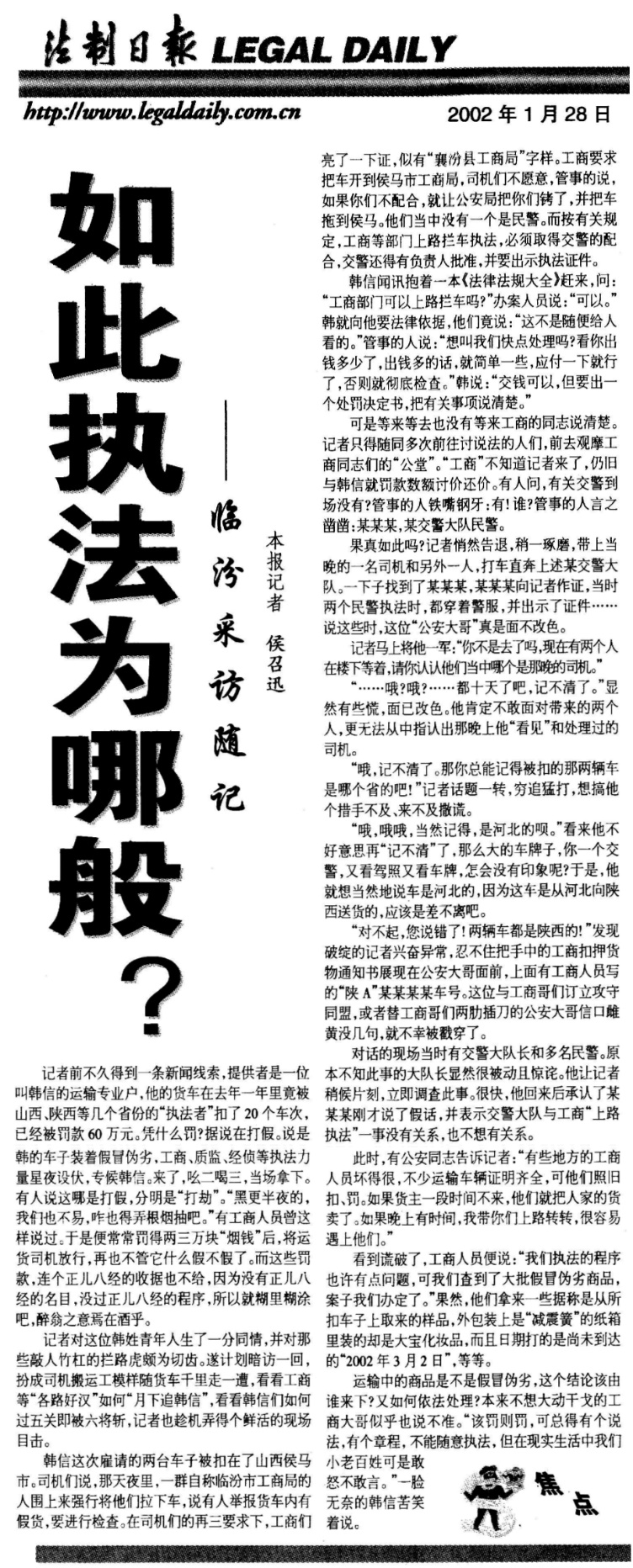 2002年初,針對(duì)山西公路“三亂(亂設(shè)卡、亂收費(fèi)、亂罰款)”之頑瘴痼疾,我根據(jù)一條新聞線(xiàn)索,隨運(yùn)輸業(yè)戶(hù)韓信千里赴晉進(jìn)行暗訪(fǎng)。在山西臨汾,分別到工商管理和交警部門(mén)暗訪(fǎng),現(xiàn)場(chǎng)目睹所謂辦案人員拒絕出示執(zhí)法依據(jù)、明目張膽要錢(qián)放行,當(dāng)場(chǎng)戳穿了兩家單位人員合伙編造的謊言,對(duì)其濫用職權(quán)亂作為的違法行為予以批評(píng)。相關(guān)報(bào)道《如此執(zhí)法為哪般》刊于2002年1月28日《法制日?qǐng)?bào)》。