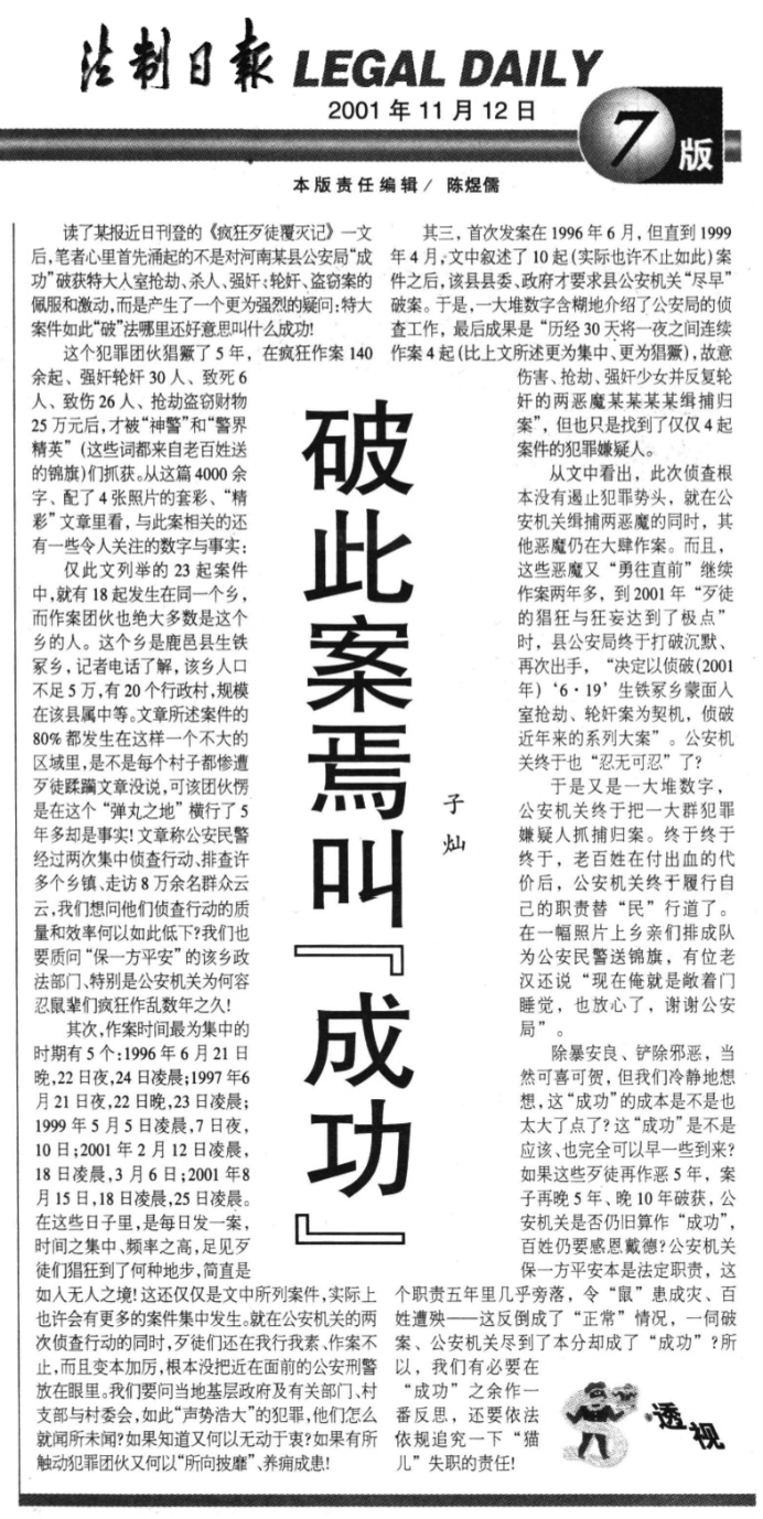 2001年11月12日,《法制日?qǐng)?bào)》刊發(fā)《破此案焉叫“成功”》。