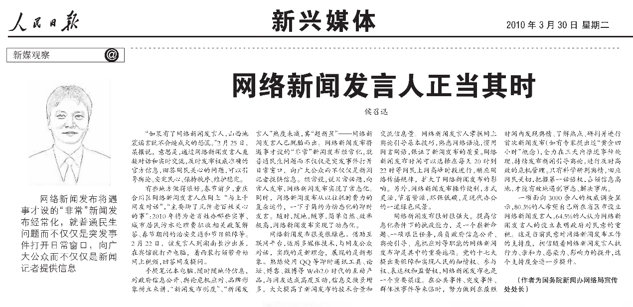 2010年3月30日,《人民日報》刊發(fā)《網(wǎng)絡(luò)新聞發(fā)言人正當(dāng)其時》。