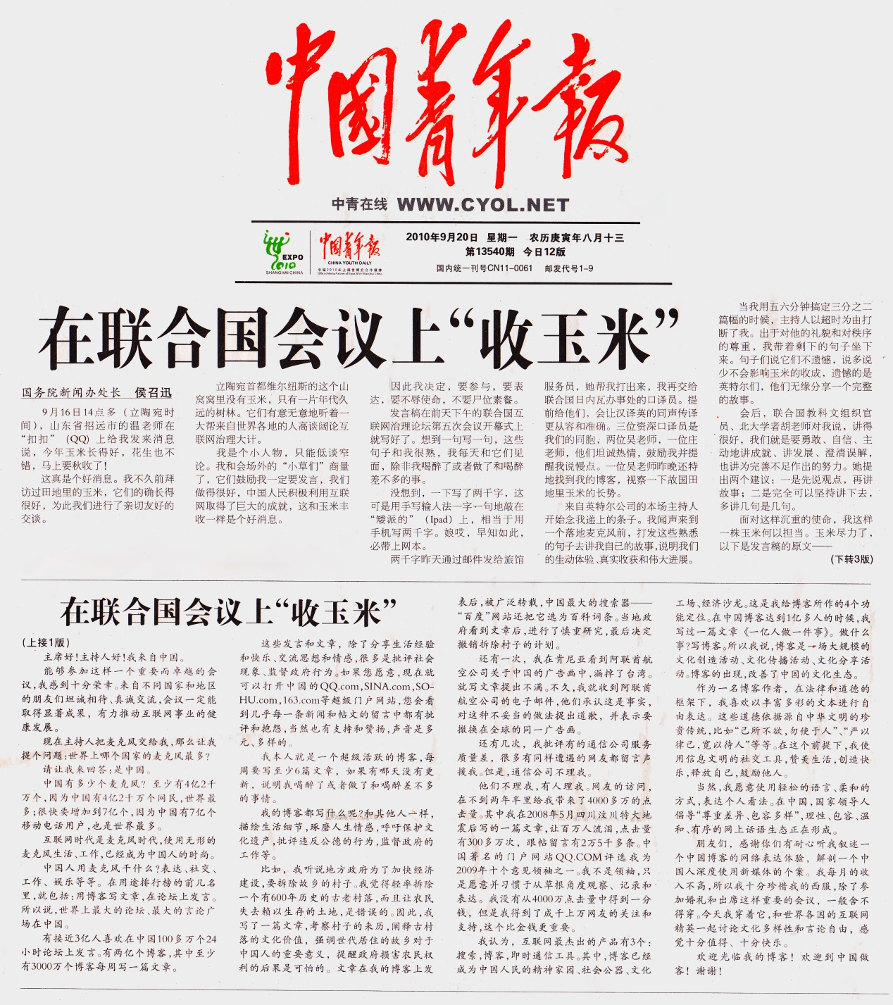 2010年9月20日,《中國青年報》一版刊發(fā)《在聯(lián)合國會議上“收玉米”》。