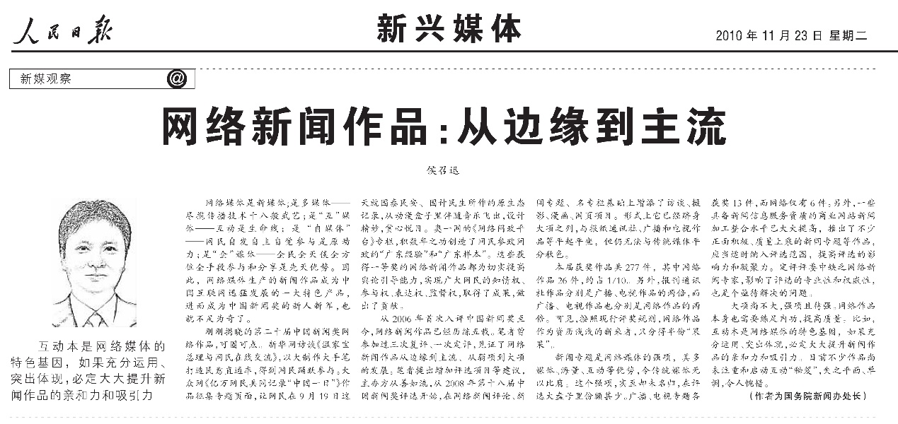 2010年11月23日,《人民日報》刊發(fā)《網(wǎng)絡(luò)新聞作品:從邊緣到主流》。