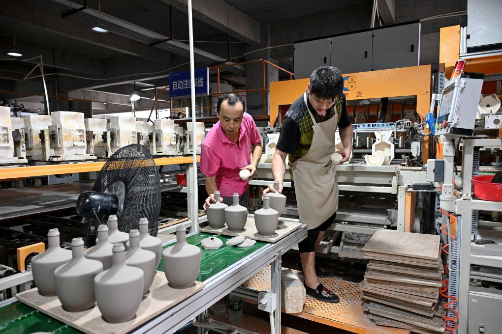 湖南銀和瓷業(yè)有限公司車間工人在生產(chǎn)酒瓶(7月27日攝)。新華社記者 蘇曉洲 攝