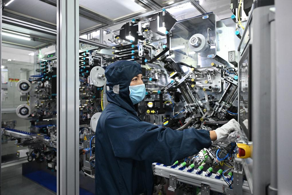 7月31日,華陽新材料科技集團(tuán)華鈉芯能科技有限責(zé)任公司的工作人員在圓柱電芯制片卷繞機(jī)上操控設(shè)備運(yùn)行。新華社記者 李鑫 攝