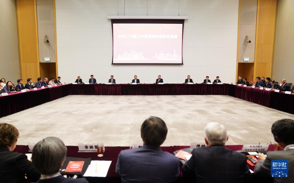 8月27日,學(xué)習(xí)貫徹黨的二十屆三中全會(huì)精神中央宣講團(tuán)在香港特別行政區(qū)與香港工商界、創(chuàng)科界代表舉行座談交流。新華社記者 王申 攝